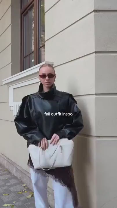 Vivi la perfetta fusione di stile e comfort con la nostra Carla Giacca in Pelle Asimmetrica — un capo indispensabile per la donna moderna che ama eleganza e carattere.