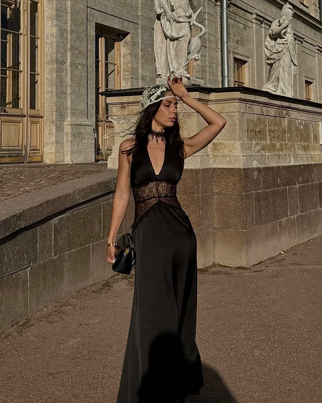 Scopri la perfetta combinazione di eleganza e stile con questo splendido abito Astrid in raso con vita in pizzo e schiena scoperta. Con profondo scollo a V e allacciatura al collo in pizzo, questo abito da sera senza schiena รจ ideale per feste estive e occasioni speciali. L'abito unisce raffinatezza, comfort e un design moderno, rendendolo la scelta ideale per chi desidera distinguersi con classe.
