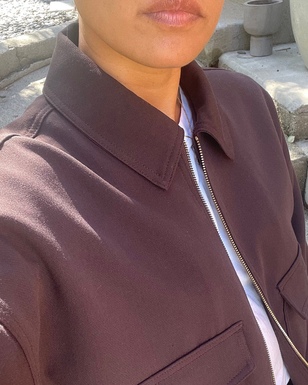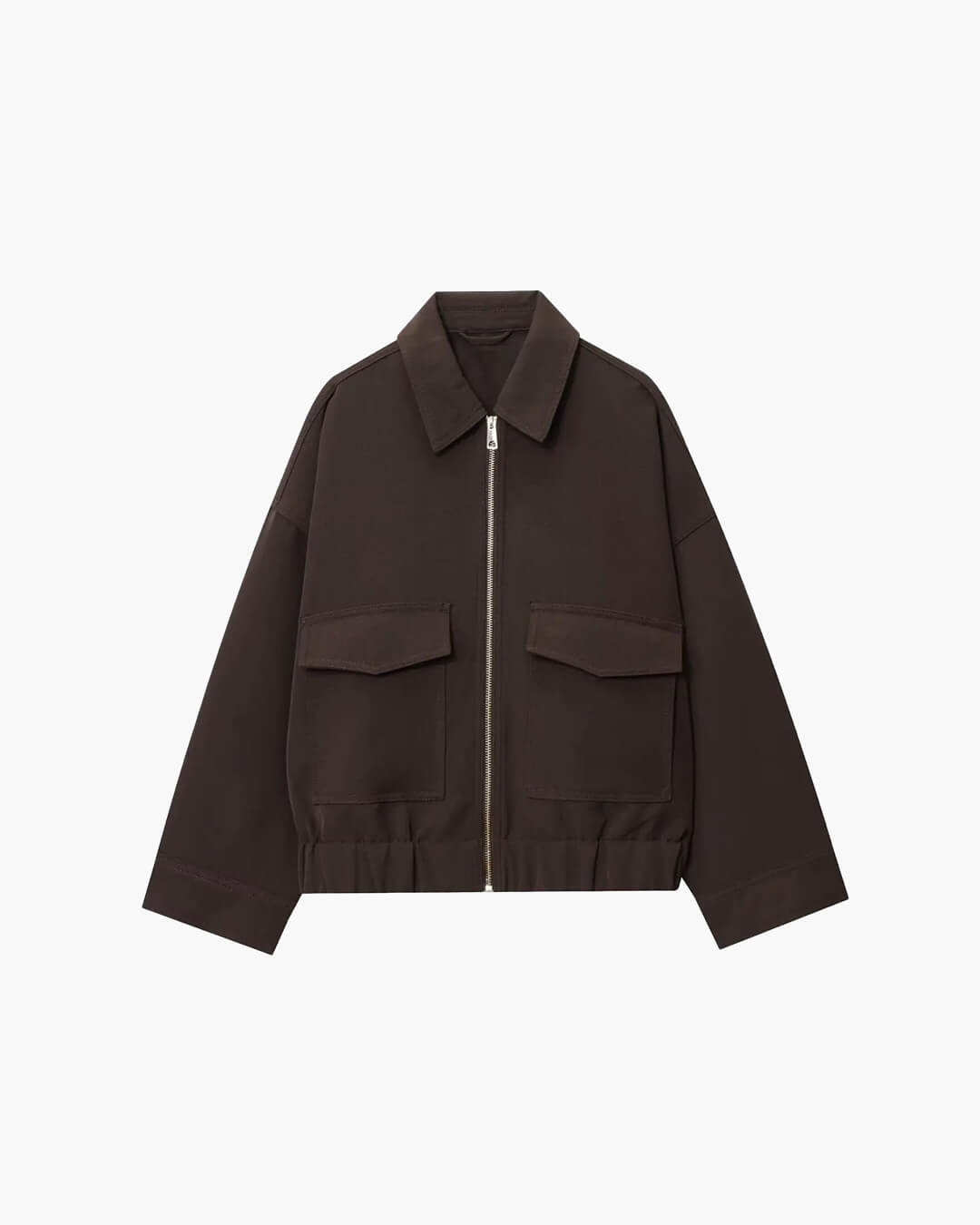 Modern Utilitarian Design: Functional flap pockets add a sophisticated, architectural element to the classic bomber shape.