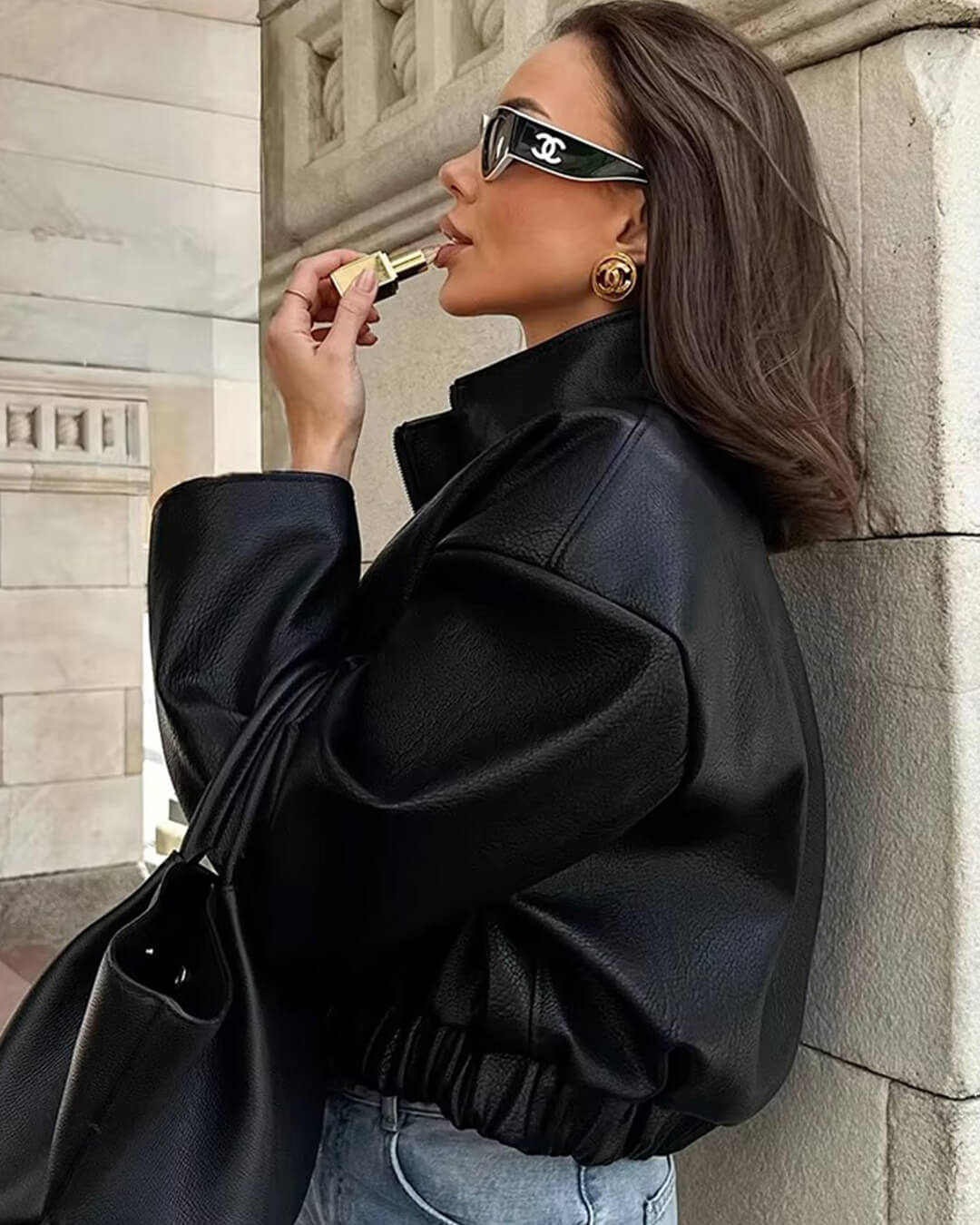 La Sylvia Zip Up Leather Jacket ti mantiene sempre al passo con la moda, offrendo al contempo resistenza e comfort per tutto il giorno. Migliora il tuo stile con la nostra giacca Premium Black PU Leather Jacket, progettata per offrirti la perfetta combinazione tra moda moderna e comoditร  quotidiana. Questo capo versatile presenta una vestibilitร  ampia e lusinghiera, un elegante colletto alla coreana e maniche lunghe per un look sicuro di sรฉ, adatto a tutte le stagioni. Realizzata con poliestere e PU leather di alta qualitร , garantisce durata, una texture liscia e una finitura lucida che valorizza ogni outfit senza sforzo. Ideale per lโ€™uso quotidiano, serate fuori, viaggi o per uno street style dโ€™impatto. Indossala sopra la tua t-shirt o felpa preferita per un look a strati facile e alla moda. Un capo dโ€™abbigliamento senza tempo che ti dona sicurezza ovunque tu vada, perfetto per chi cerca una giacca in pelle nera di tendenza e resistente.